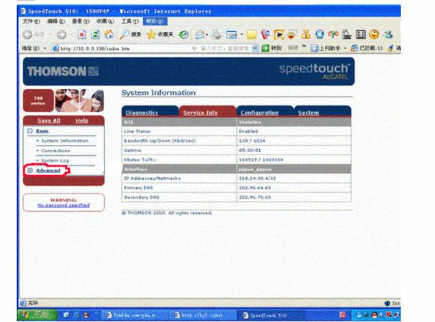 4.7.5.2 When logging in, the basic interface of ALCATEL511 appears and then click the column ADVANCED in the left of the screen