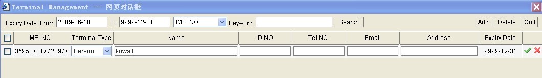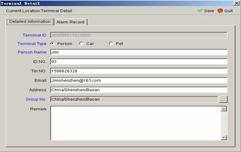 Type in the terminal IMEI number in the field of Terminal ID, then click Save to store the user’s information filled out as shown in figure.